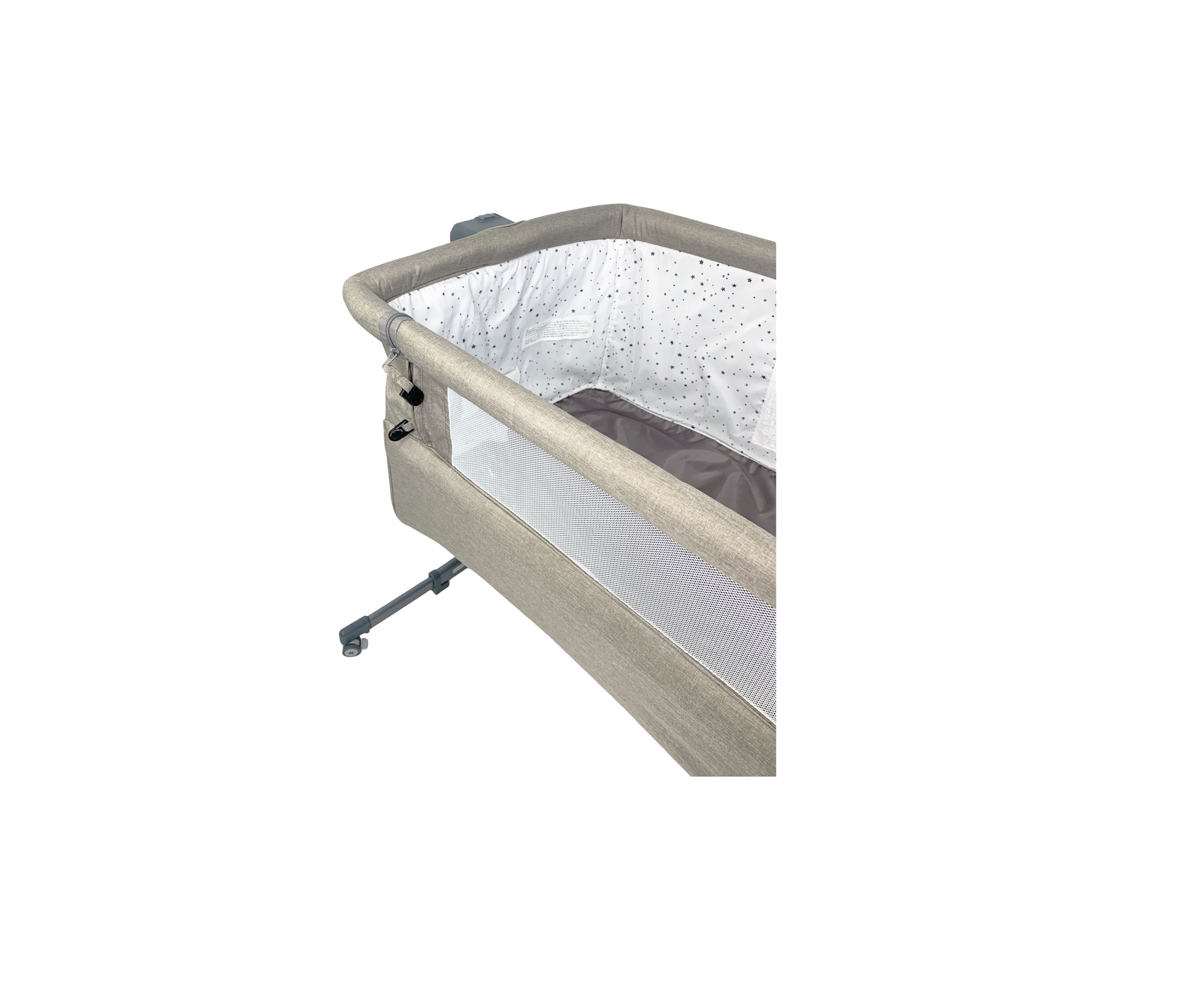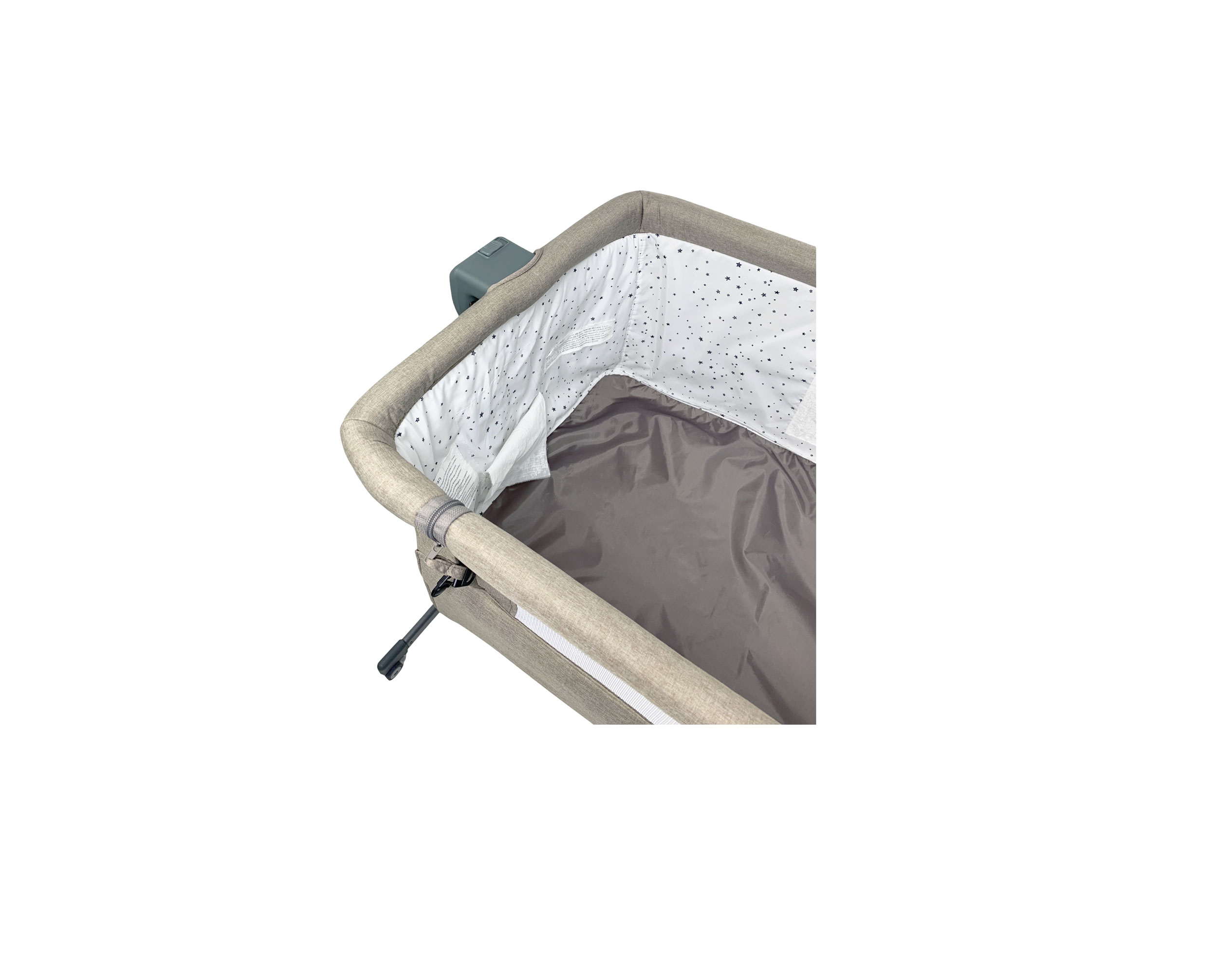Width of the legs (leg spacing): 89 cm Dimensions of the carrycot: 90x57x52.5 cm Mattress: length 89 cm, width 52 cm, Adjustment range from the floor to the parent’s mattress: 49.5–61.5 cm Folded (in the bag): 49.5–61.5 cm, Weight: 9.9 kg The NESTE UP co-sleeper cot can easily be connected to the parents' bed, so your little one can be close to you at night. The co-sleeper cot will not only make feeding at night easier, but will also ensure a peaceful sleep close to your child. The NESTE UP co-sleeper cot has a durable, strong construction made of steel. The set includes a hard mattress, which will ensure a comfortable and peaceful sleep for the toddler (hard mattresses are recommended for children by physiotherapists during the first months of life). A cotton sheet matching the mattress is included. The NESTE UP is a 3-in-1 product – it serves as a co-sleeper bed, an independent baby cot, and can replace a travel cot. You can easily adjust the height of the mattress level. The NESTE UP has five height levels, so you can easily adjust it to the height of your bed. The cot has the option to adjust the angle of the mattress on two levels. Your child has a runny nose, and you want to make it easier for them to breathe. No problem – just adjust the mattress accordingly. *This item includes only what is shown in the pictures listed on the Nextmom website.