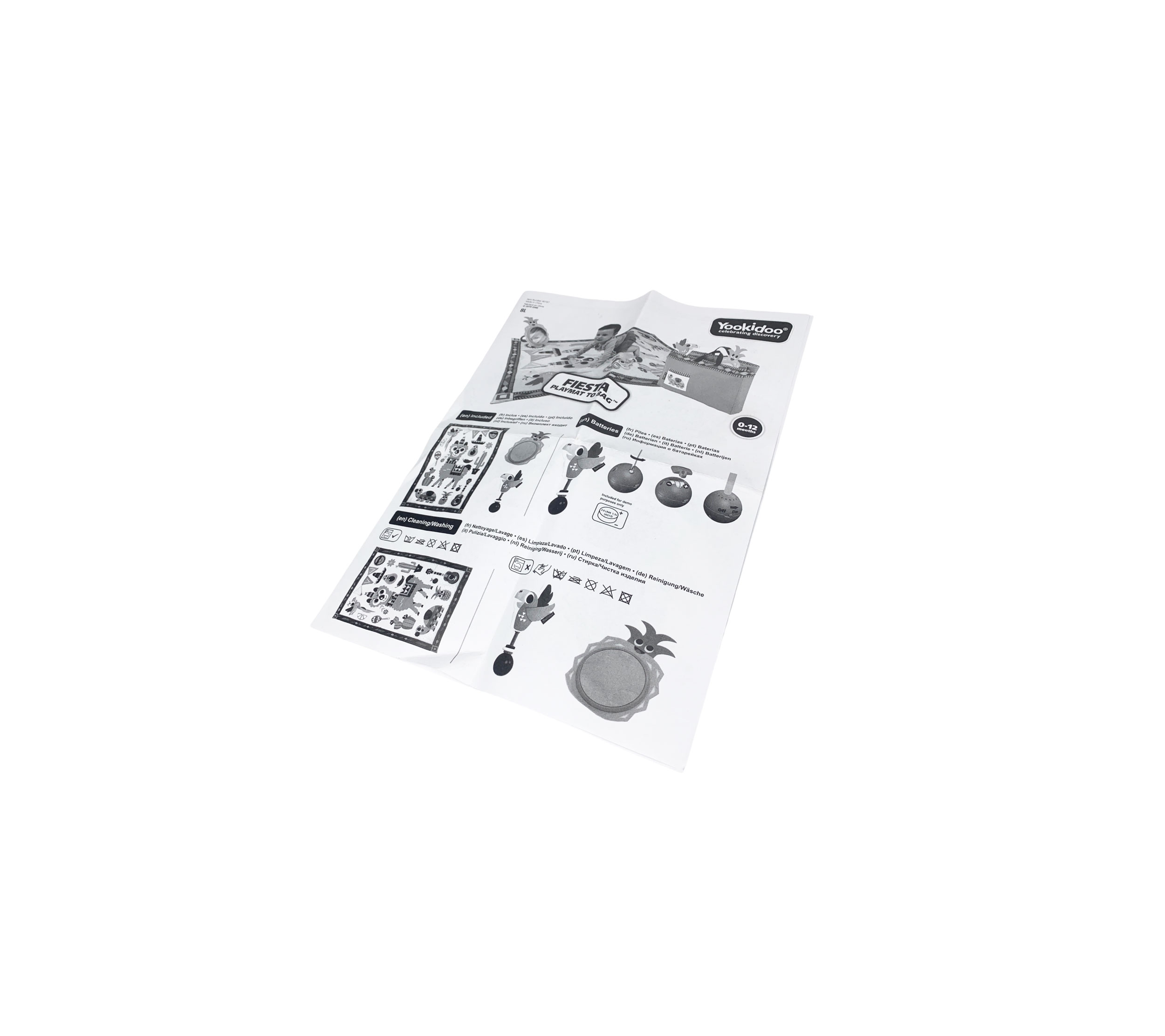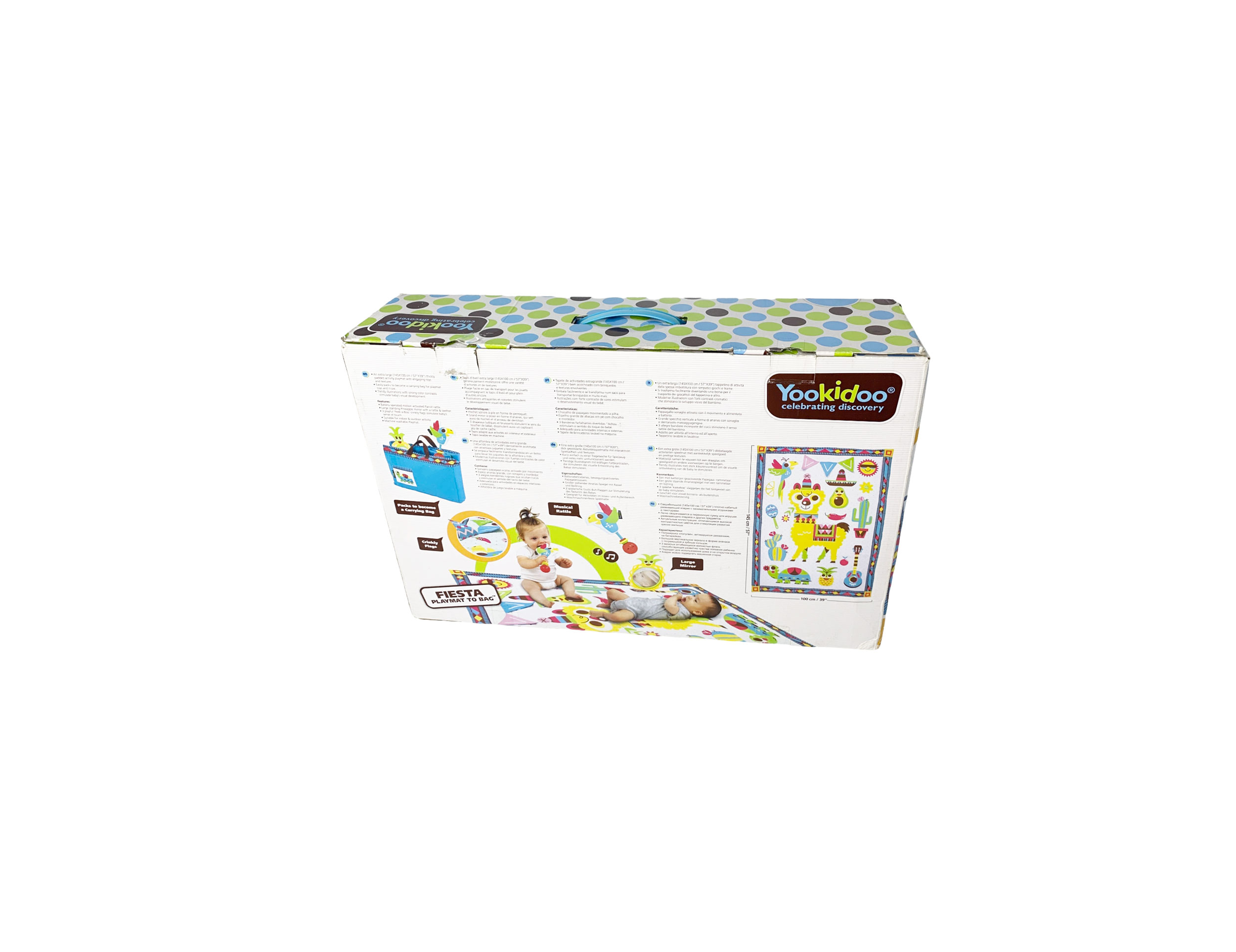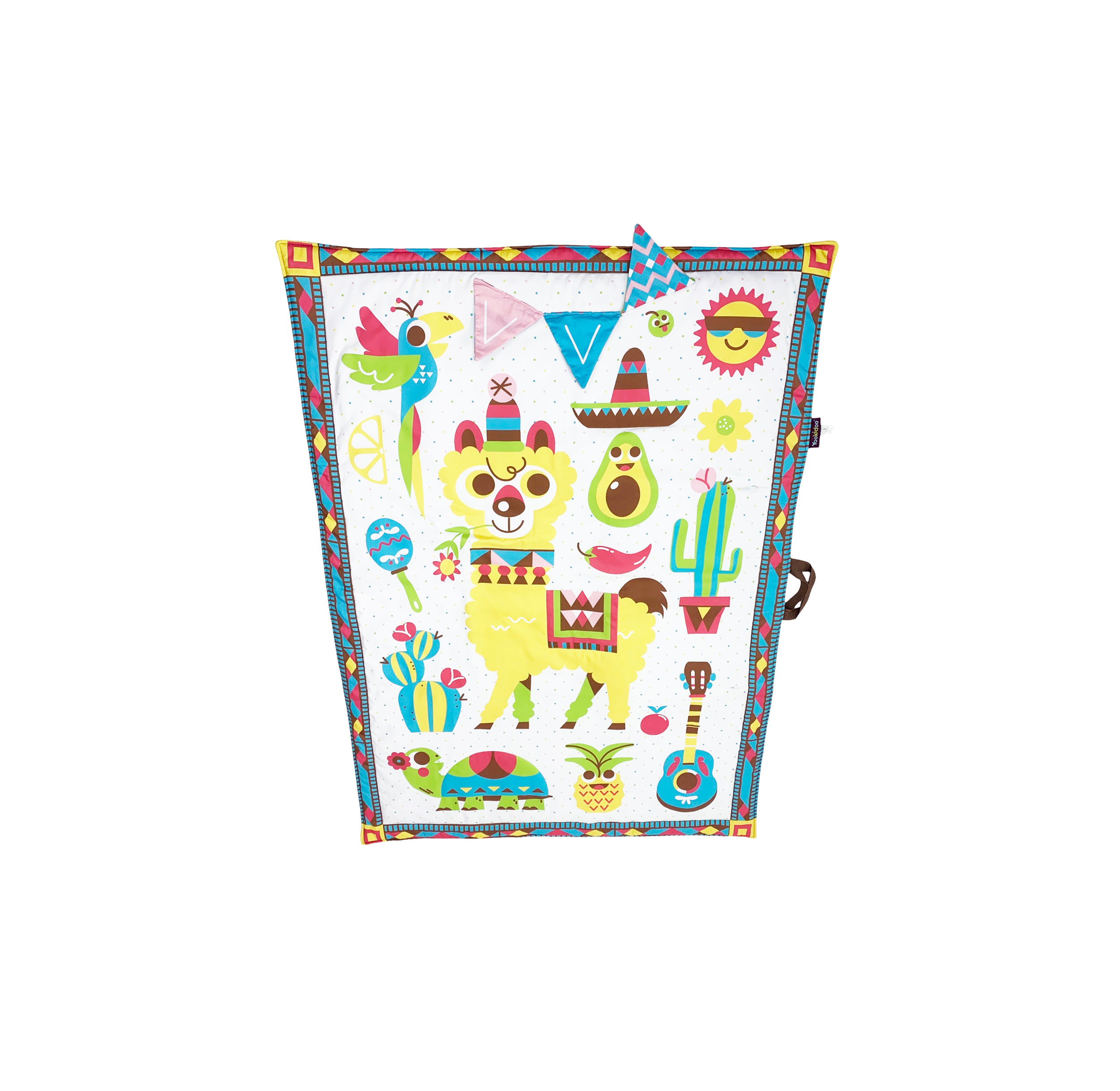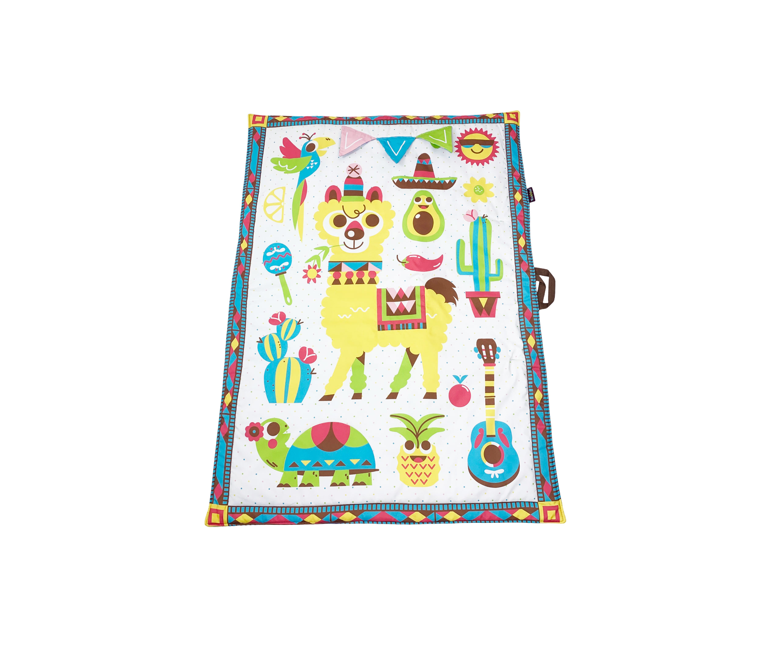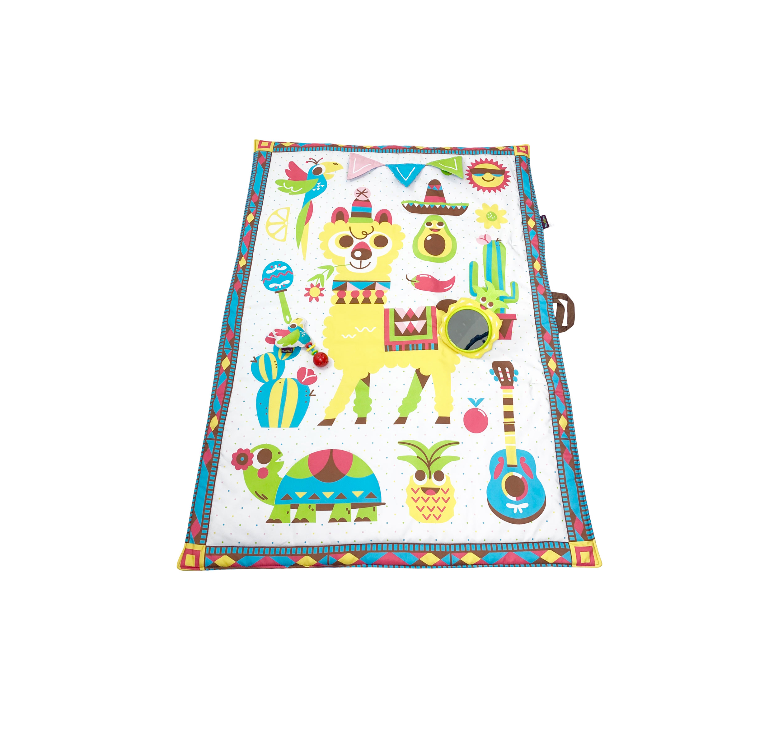 This machine-washable playmat is 57 x 39 inches (145 x 100 cm) when opened. Place your baby on the playmat and let the fiesta begin! The fun, trendy illustrations and strong contrasting colors will stimulate your baby’s visual development, and the three playful 'peek-a-boo' crinkly flags ensure doing so for your baby's sense of touch. Make playtime and learning as fun as can be with activities designed for entertaining tummy time, turning over, and sitting up to play. And there’s plenty of room on the playmat for your mum or for another baby to join for a playdate. Introduce the lovable accessories – a motion-activated, battery-operated musical rattle shaped like a parrot and a large standing pineapple-shaped mirror with a rattle and teether. Unfold the extra-large, thickly padded, soft activity playmat and lay it down on a flat, ground-level surface, indoor or out. When the fun is done, fold the playmat and accessories into its integrated carrying bag with a convenient, hidden pocket for additional toys. *This item includes only what is shown in the pictures listed on the Nextmom website.